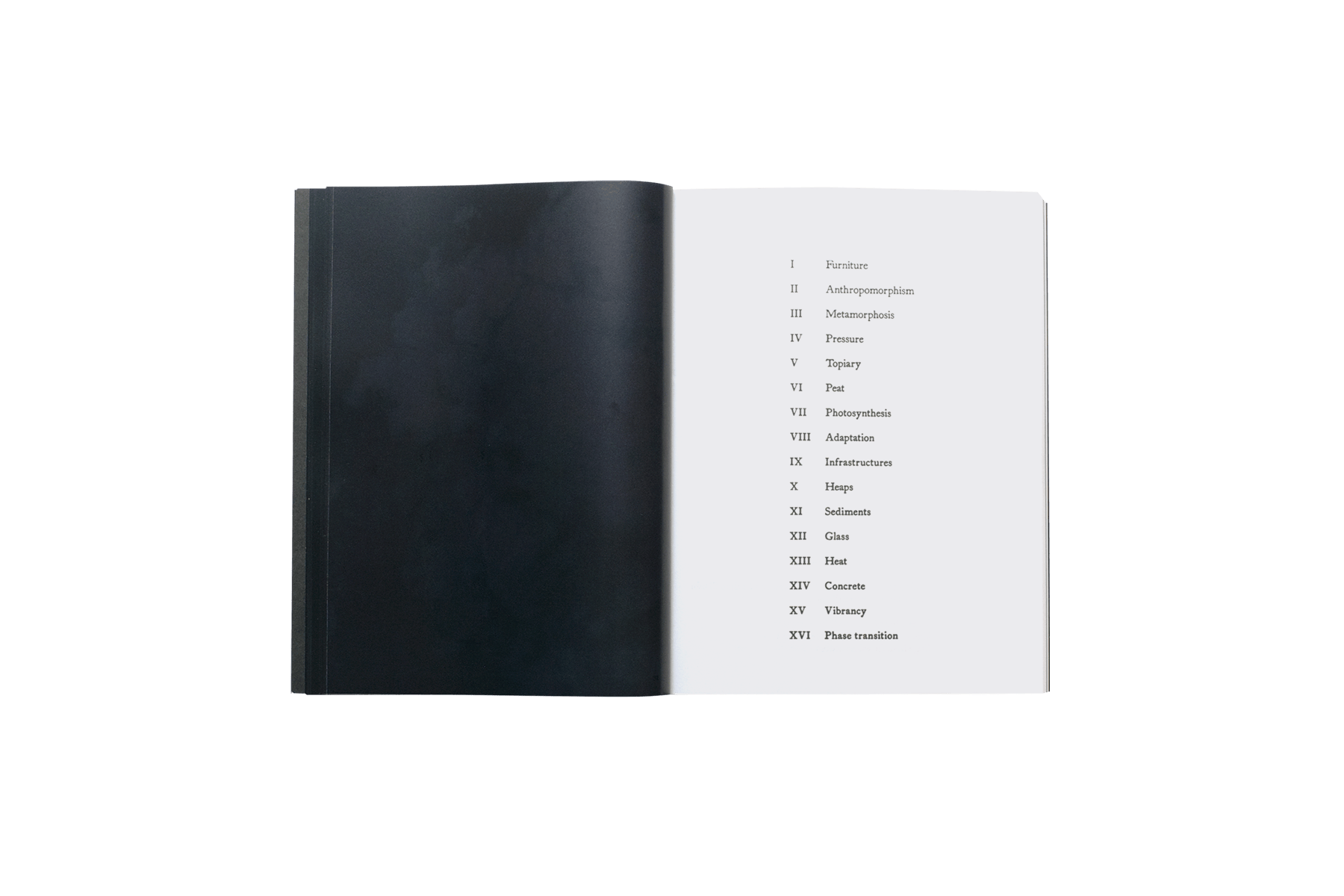 Attitudes of Stone begins with an image sequence of Philipp Modersohn's objects, which seem to morph into one another. These 16 protagonists stand in for materials and processes: furniture, anthropomorphism, metamorphosis, pressure, topiary, peat, photosynthesis, adaptation, infrastructures, heaps, sediments, glass, heat, concrete, vibrancy, phase transition. Subsequently, these constellations unfold in poetic and theoretical contributions by authors from a variety of fields, along with pseudoscientific diagrams and documentation of the site-specific installations. A horizontal dialogue can begin: between the different sections as well as with the contributors, humans, things, and processes alike. Meanwhile, the ink on the page fluctuates as if the printing press itself is breathing.